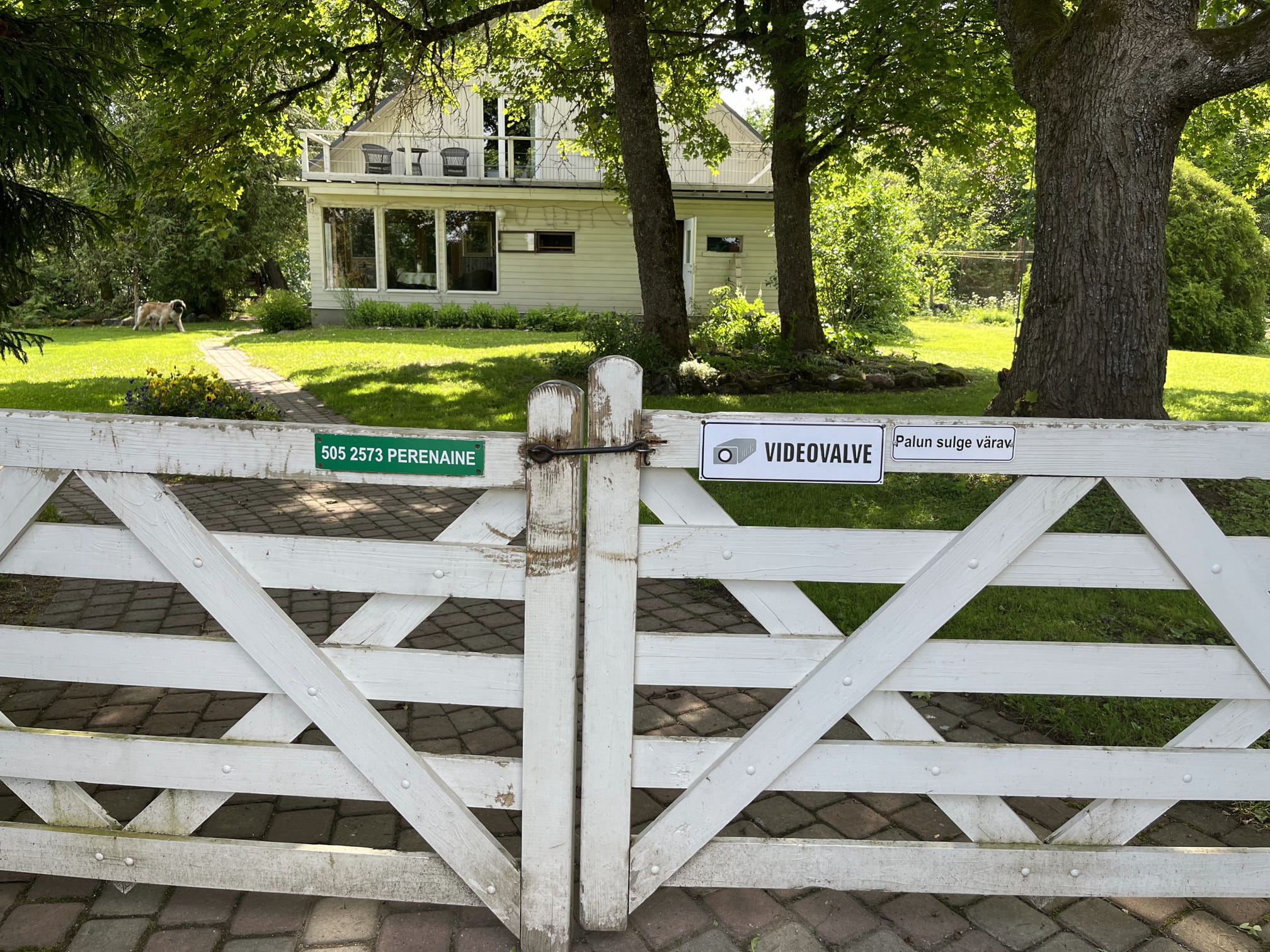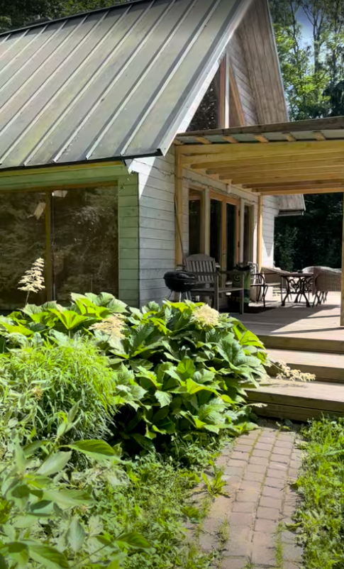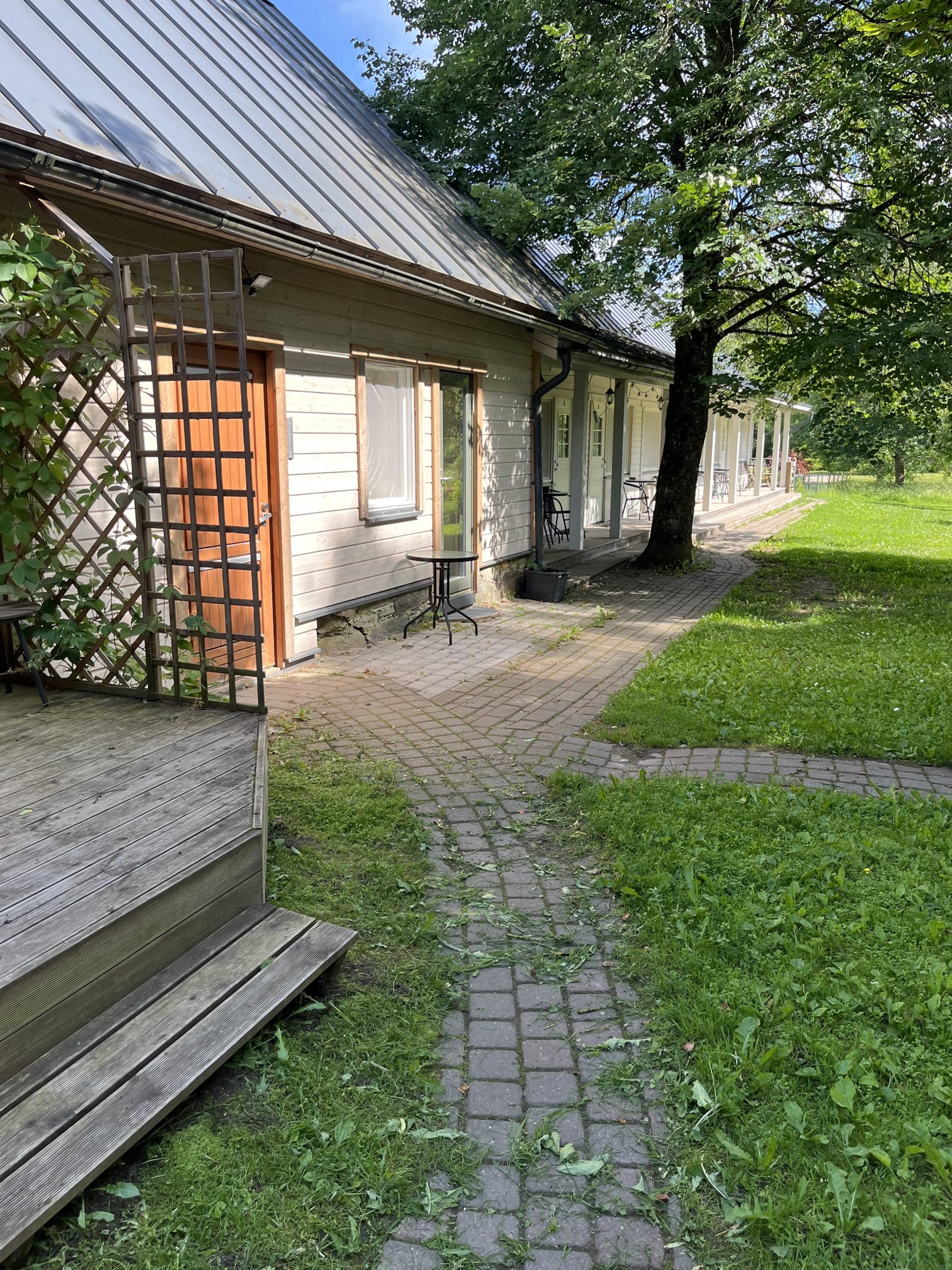 You can park in a car park with an unpaved, compacted surface before entering. There are no designated parking spaces for people with disabilities. When entering the garden, a sign informs visitors that there is a dog in the garden. The garden has seating options, a small lake where you can swim, and a stepped terrace by the sauna house.