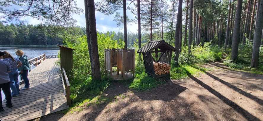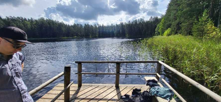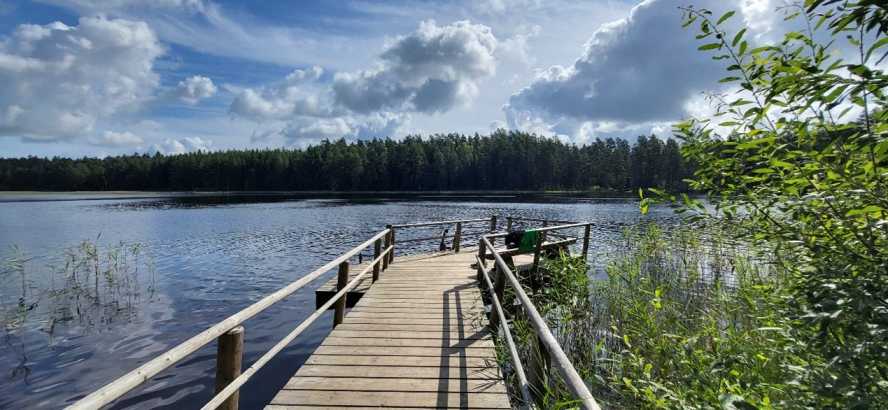 A recreation area with a footbridge and a relaxation platform has been created at Lake Niedrājs. Currently, there is no parking lot at the recreation area. The surface leading up to the footbridge is solid and stable and suitable for wheelchair users. The footbridge is made of smooth planks without any changes in level. At the end of the footbridge, there is a recreation area with a bench and handrails. The handrails can be used to support fishing rods, which is necessary for people with mobility impairments. There is a table with benches next to the rest area, and it is possible to approach the end of the table with a wheelchair (by passing under the table surface with your legs).
