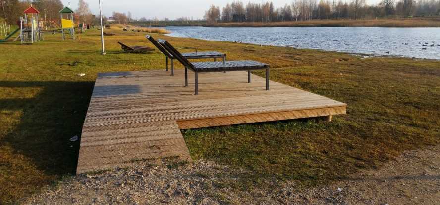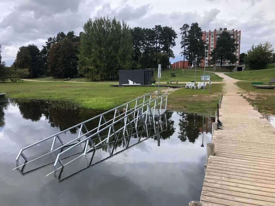 In Ogre, on the banks of the Daugava River (old riverbed), there is a beach where you can enjoy various water activities, rent SUP boards, and use an inflatable island. The beach has a portable toilet that is also accessible to people with disabilities. Access to the beach for people in wheelchairs is provided by a gravel path, which was built by the local government specifically for this purpose. The access road is fairly flat, but quite long, so people in manual wheelchairs are advised to use the assistance of an assistant. Access to this site is for pedestrians only. The swimming area has a ramp that allows wheelchair users to enter the water comfortably and safely, and is also convenient for people with balance problems, limited joint mobility, and similar conditions. This location offers SUP rentals, which are suitable for people with mobility impairments, including those who use wheelchairs. The beach has sunbathing benches that are easily accessible by wheelchair on a stable surface. In summer, a portable toilet is available for people with mobility impairments.
