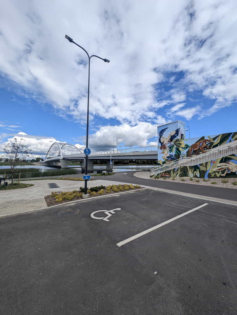 2 accessible parking spaces are available near the lift with a sign showing towards the elevator. However, on the asphalt side facing the river, there are no railings or warning markings, which poses a risk of falling into the water in case of an accident.