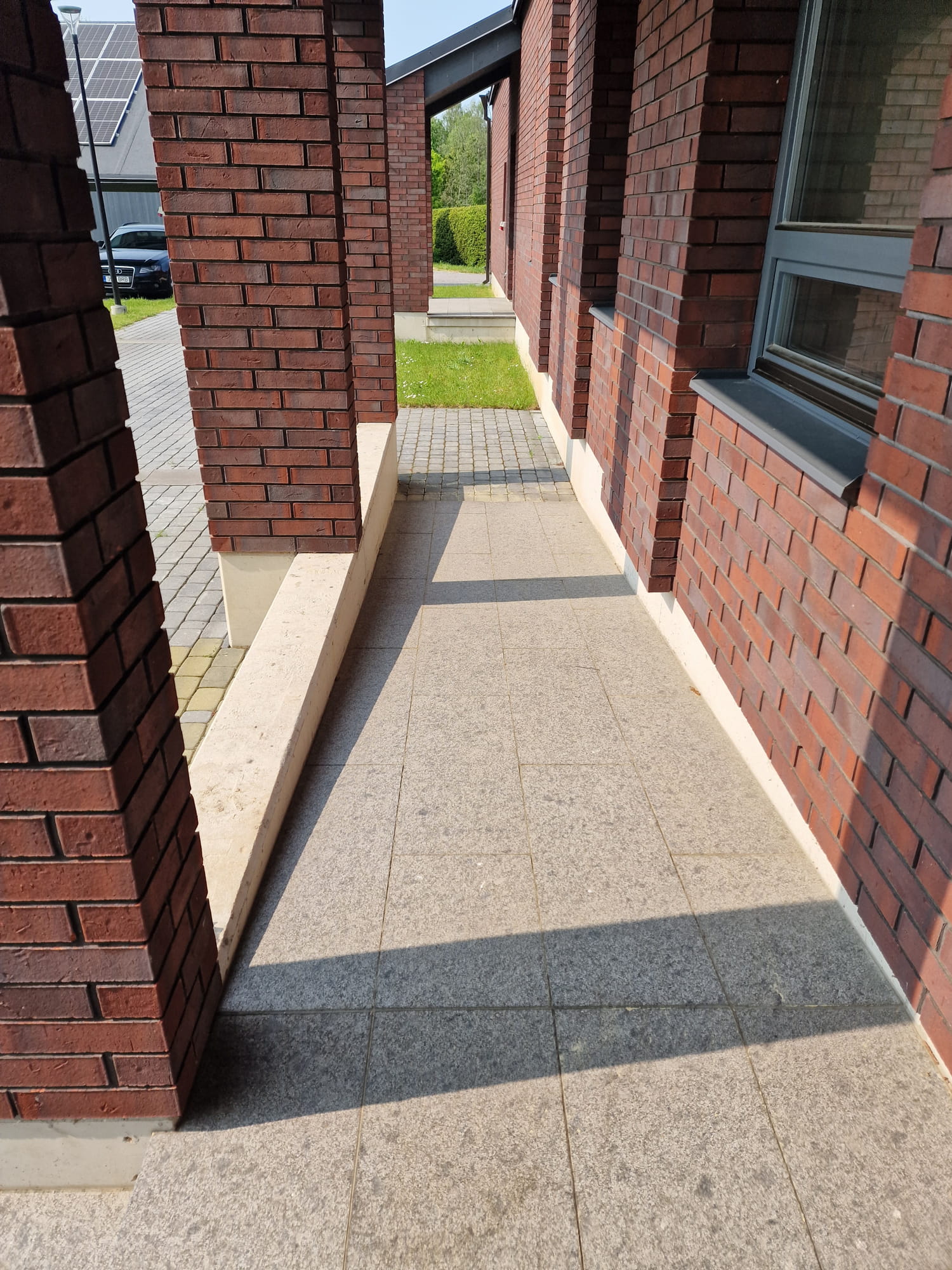 There is a large parking area on the right side of the building; however, there are no designated parking spaces for people with disabilities. To access the library, there is a ramp at the back of the building, where parking is also possible. The ramp leading into the building is rather steep (with a gradient of more than 5%). The door is heavy to open.
