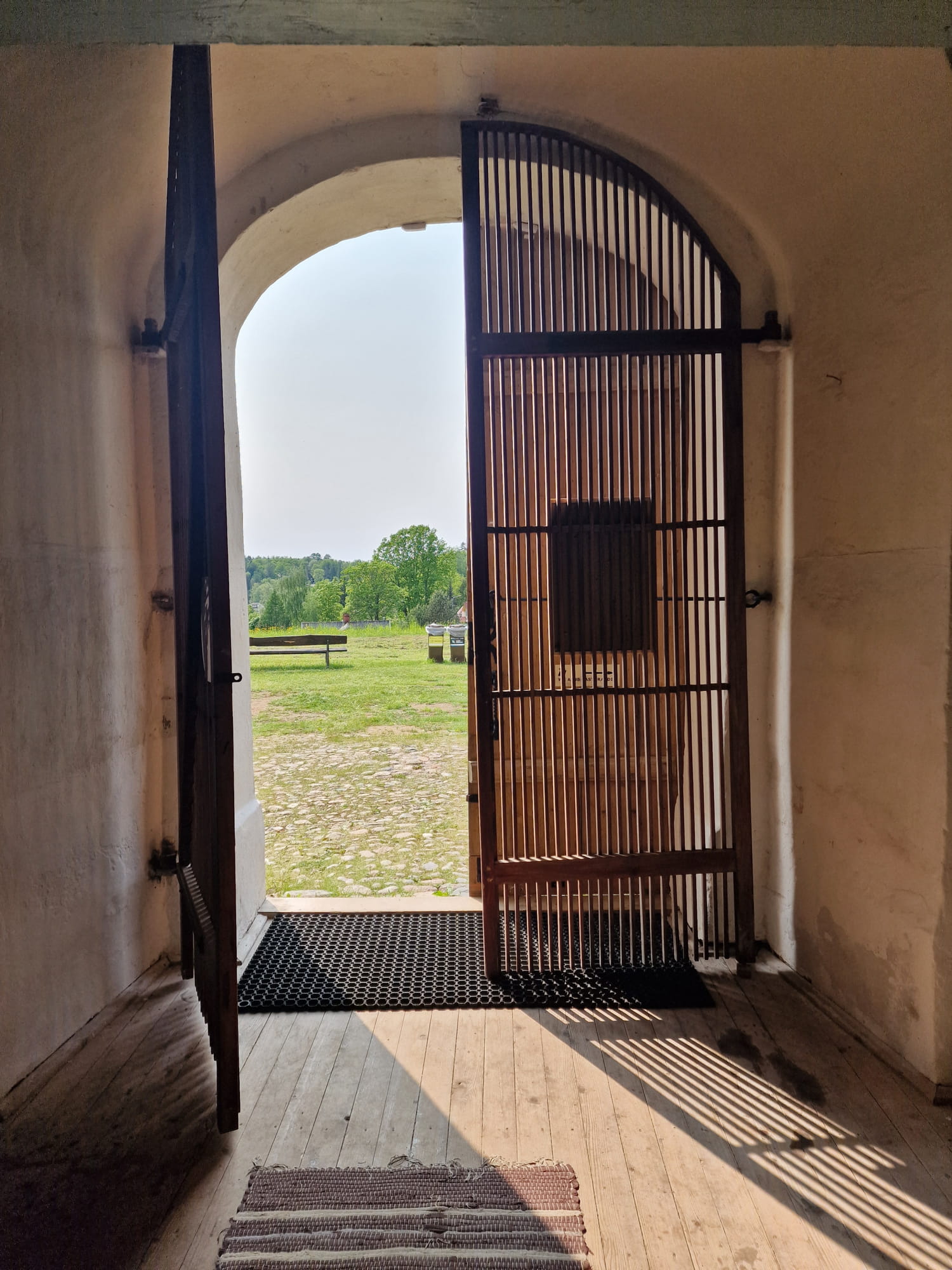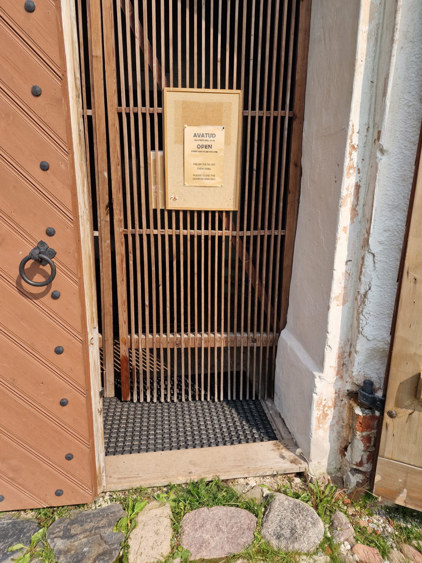 The route to the church runs across an open grassy area. The surface along the way varies between compacted ground, grass, and cobblestone paving. In the entrance corridor, there are doormats between the two doors, and after entering there is a raised threshold (higher than 4 cm).