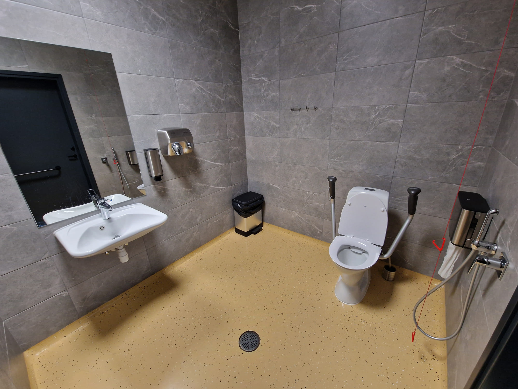 Inside the store, immediately to the left upon entering, there is a large and spacious restroom with properly ensured contrast, a hand shower, grab bars, and other necessary features, as well as a baby changing table. To the right, there are elevated bar counter–style seating areas and a table.