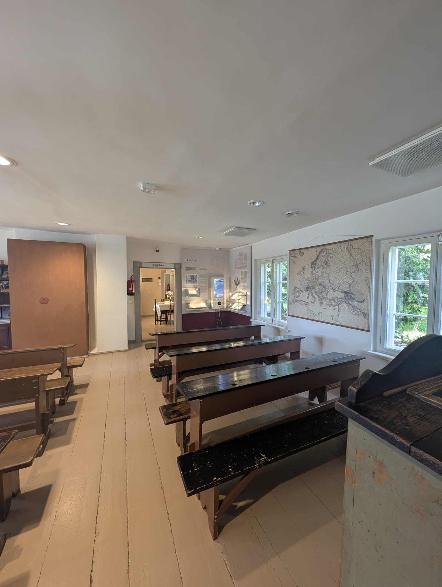 Muuseumi teeninduslett ja vastuvõtuala asuvad näituse esimeses ruumis ehk endises klassiruumis. Peauksest sisenedes on see esimene ruum. Tagauksest sisenedes tuleb pöörata vasakule, minna trepist alla otse läbi söögisaali ja klassiruumis paremale.