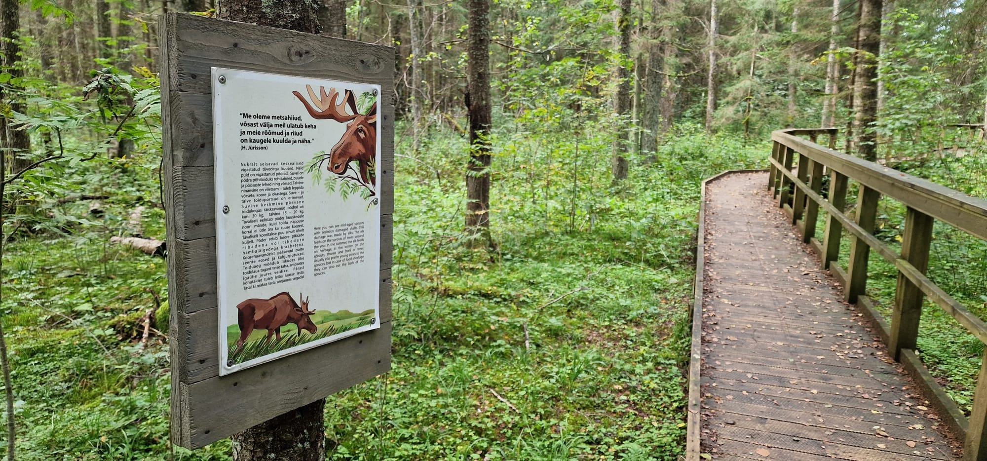 There is a short tactile path leading to the ramp that leads to the Soomaa National Park Visitor Centre where there is an accessible toilet, a platform lift to the second floor. The Visitor Centre offers nature education programmes for educational institutions and an exhibition The soon-to-be-opened (from 2026) permanent exhibition “Through Soomaa with a Dugout Canoe”.