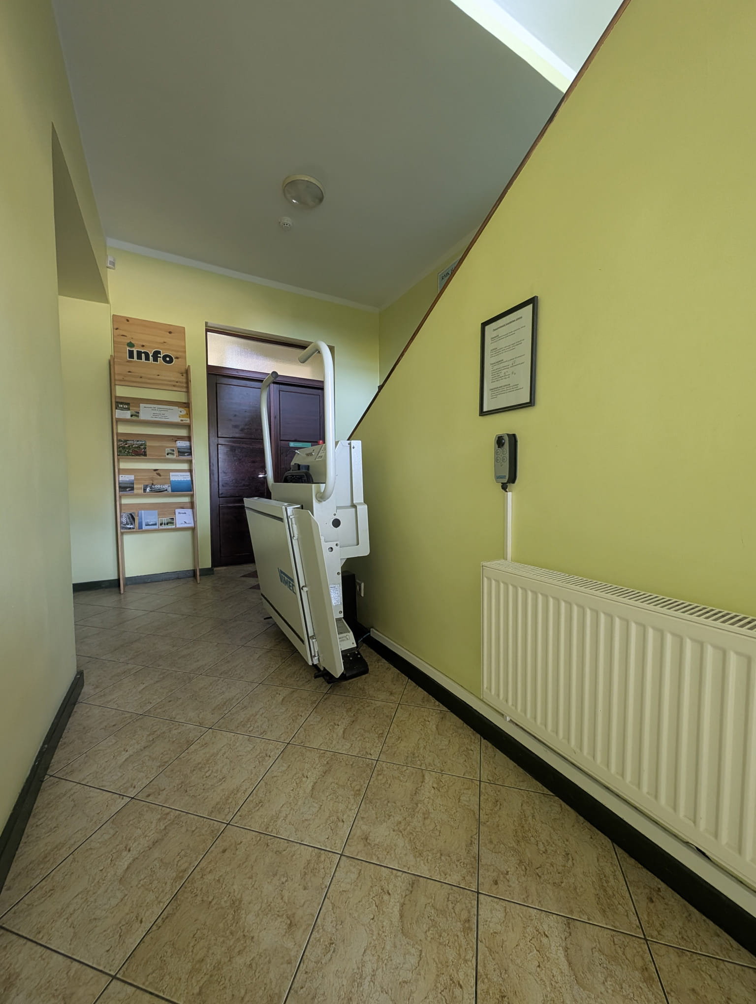 Sissepääsu juures on 3,5 m pikkune kaldtee (15% kalle, ilma käsipuuta). Esimesel korrusel asub invatualett, teisele korrusele pääseb platvormtõstukiga Vimec. Parkla on asfaltkattega ja heas seisukorras, kuid eraldi tähistatud invaparkimiskohta ei ole. Parklas puuduvad äärekivid ja takistused, ruumi on tavaliselt piisavalt.