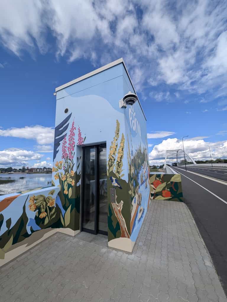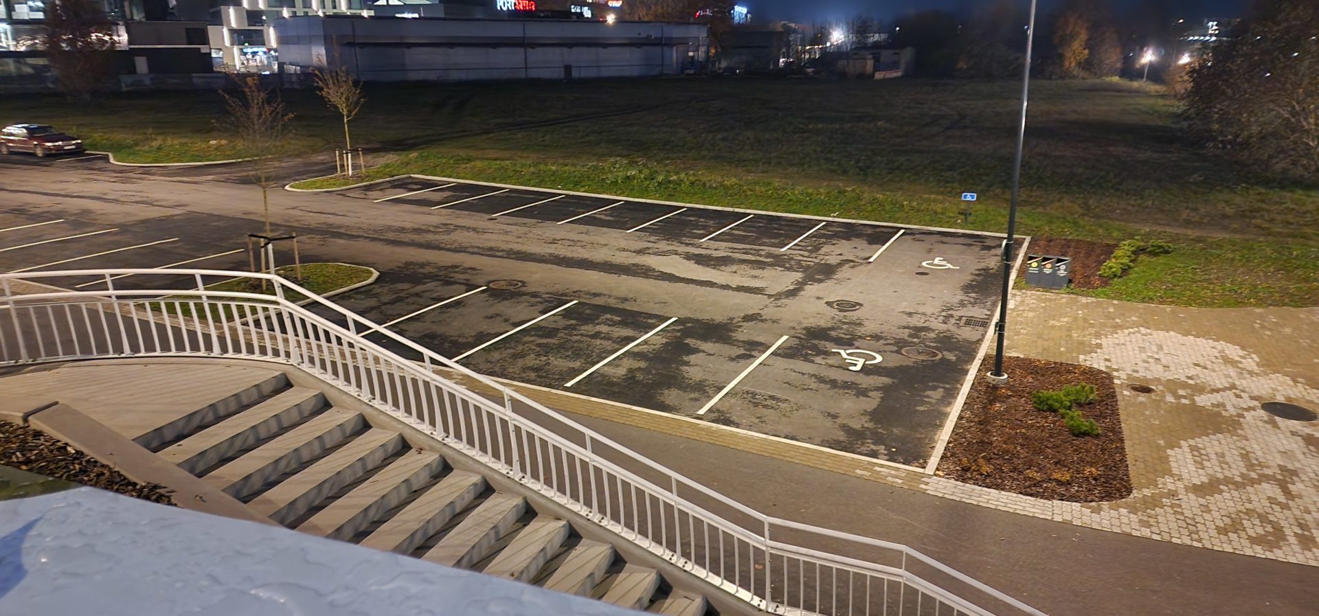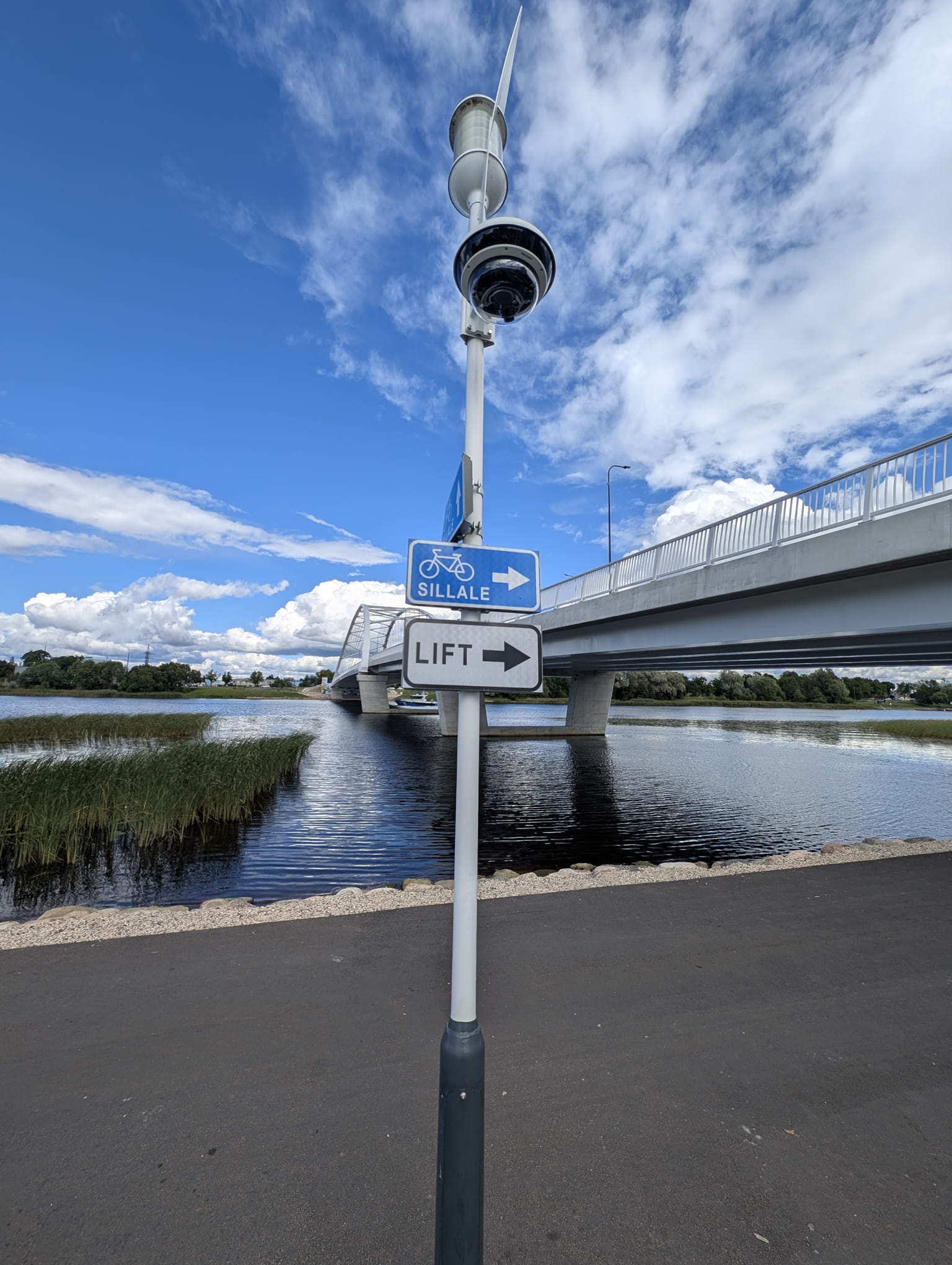 Tähistatud puudega isiku parkimiskoht asub lifti lähedal ning lifti suund on viidaga tähistatud, asudes parkimiskohast kella 11 suunal. Asfaldteeritud jõe poolsel küljel puuduvad piirded ja hoiatusmärgised, mis võivad kujutada ohtu vettekukkumiseks.