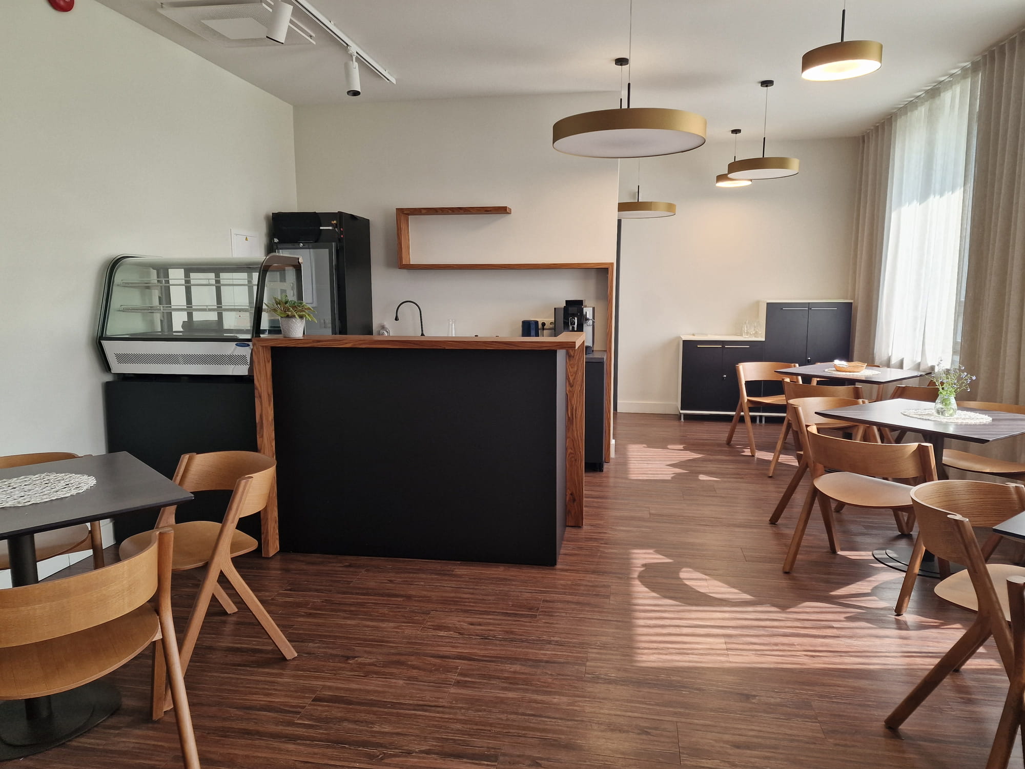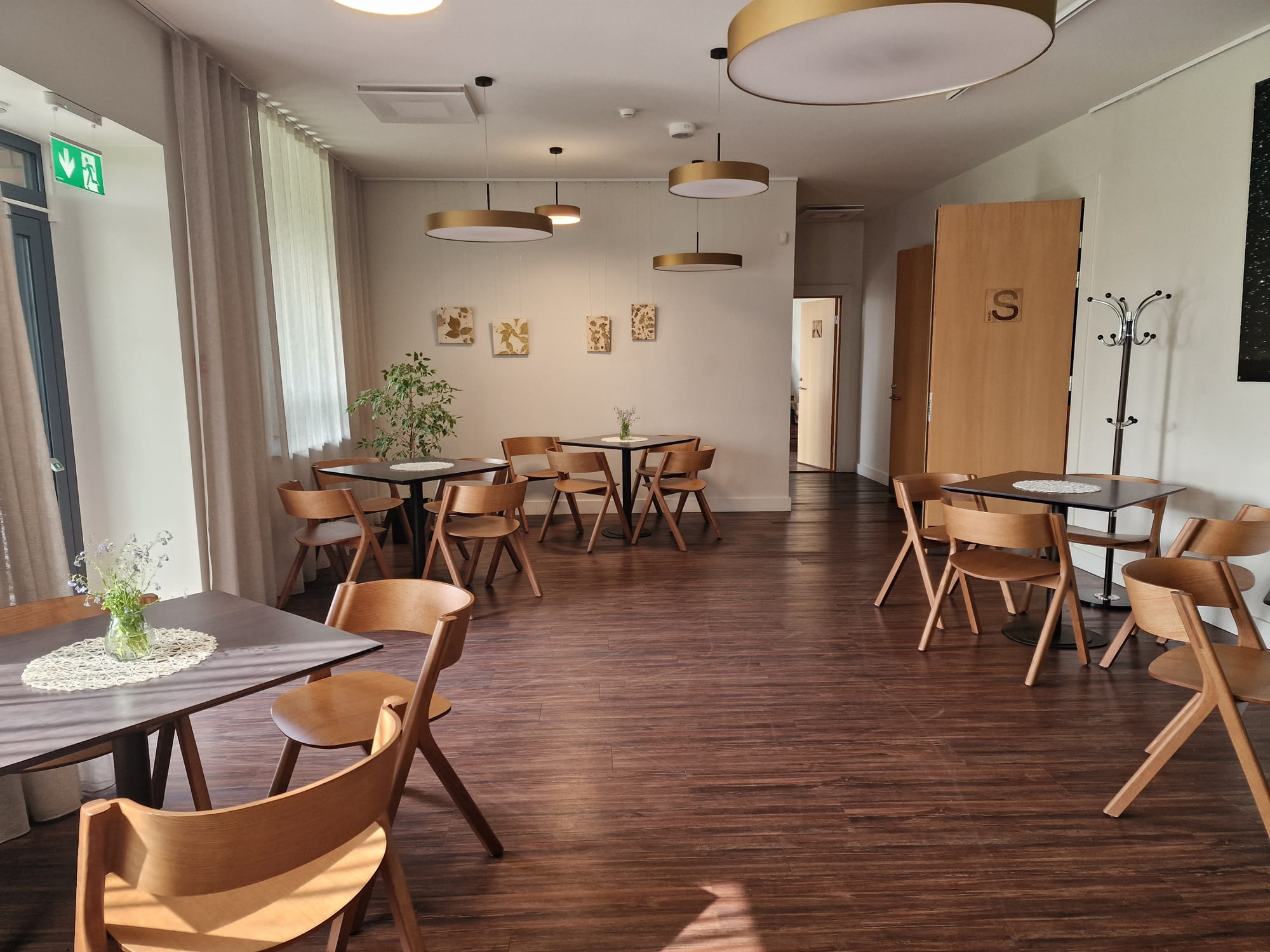 Sisenemine on toitlustusalale, kust on võimalik saali kaudu liikuda raamatukokku. Toitlustusala lõpus vasakut kätt on ligipääsetav tualettruum, kus on piisavalt ruumi abivahendiga liikujatele. Tualettruum on tähistatud, olemas käetoed jne, kuid ei ole beebide mähkimislauda.