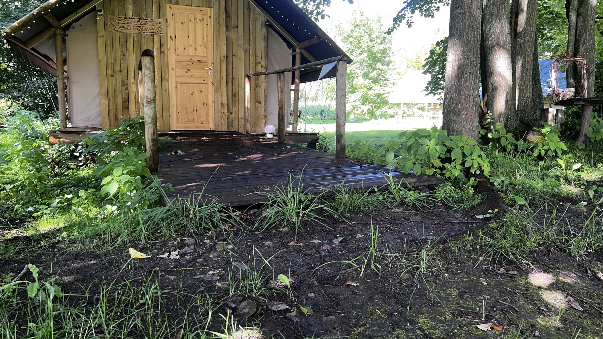 Telkmajadeni viib kõvendatud pinnase ja murukattega tee ning telkmajade ees on puidust laudisega teed. Osade telkmajade ees on trepiastmed, teiste puhul tuleb maapinnalt astuda kõrgemale puitlaudisele, mis tähendab, et sisenemisel on siiski aste ning kaldtee puudub.
