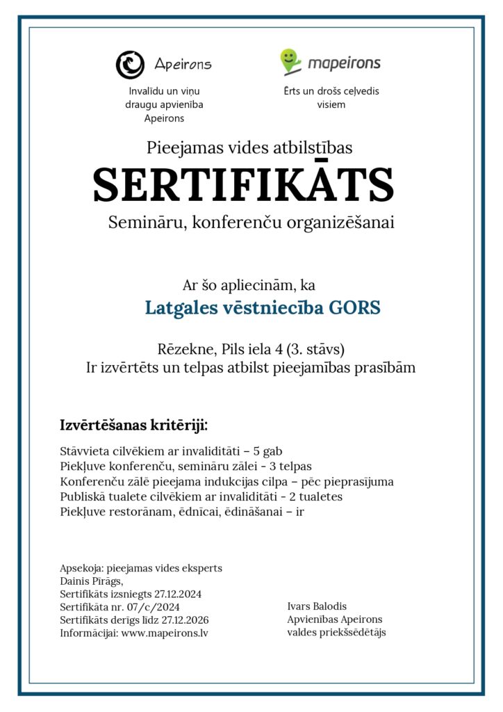 Invalīdu un viņu draugu apvienība “Apeirons” piešķīrusi Latgales vēstniecībai GORS Pieejamas vides atbilstības sertifikātu semināru un konferenču organizēšanai!