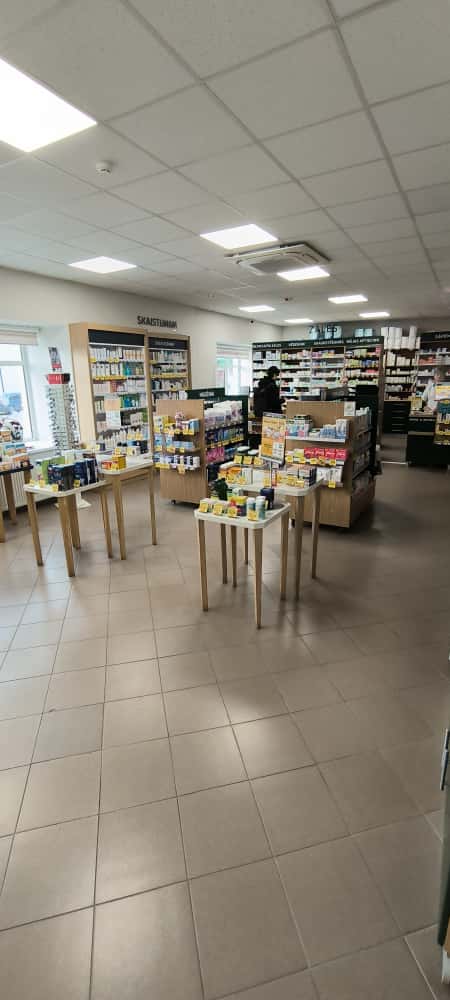 Aptiekā plašas telpas, kāpnes iekšpusē marķētas, cilvēki ratiņkrēslā viegli var pārvietoties pa lēzenu uzbrauktuvi.