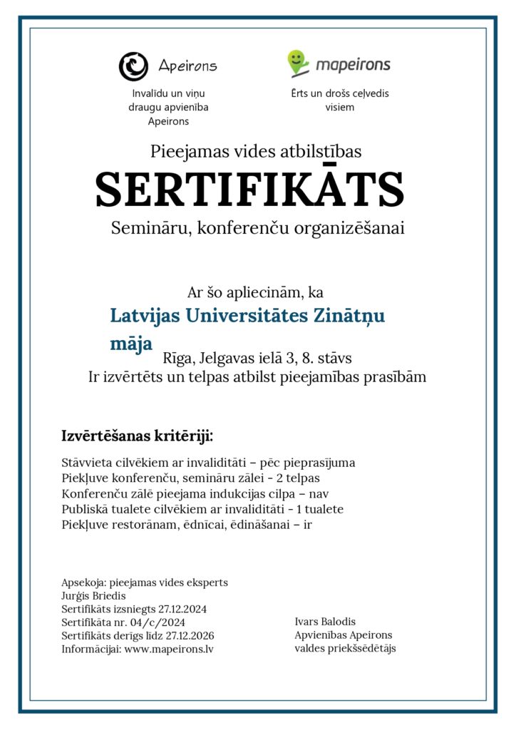 Pieejamas vides atbilstības sertifikātu semināru un konferenču organizēšanai Invalīdu un viņu draugu apvienība “Apeirons” piešķīrusi Latvijas Universitātes Zinātņu mājai.