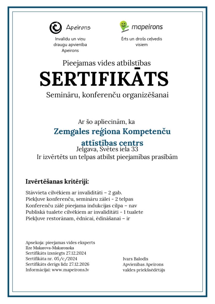 Invalīdu un viņu draugu apvienība “Apeirons” piešķīrusi Zemgales reģiona kompetenču attīstības centram Pieejamas vides atbilstības sertifikātu semināru un konferenču organizēšanai!